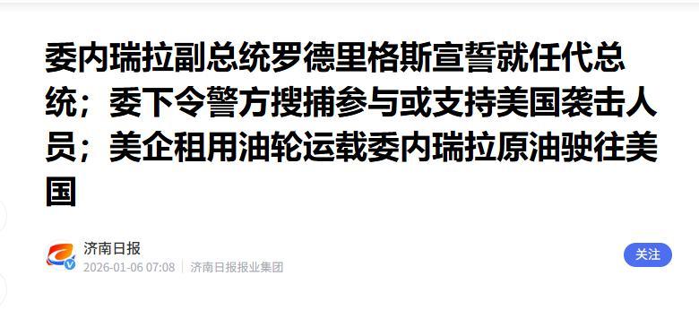 济南日报2026-01-06 委内瑞拉副总统罗德里格斯宣誓就任代总统;委下令警方搜捕参与或支持美国袭击人员;美企租用油轮运载委内瑞拉原油驶往美国