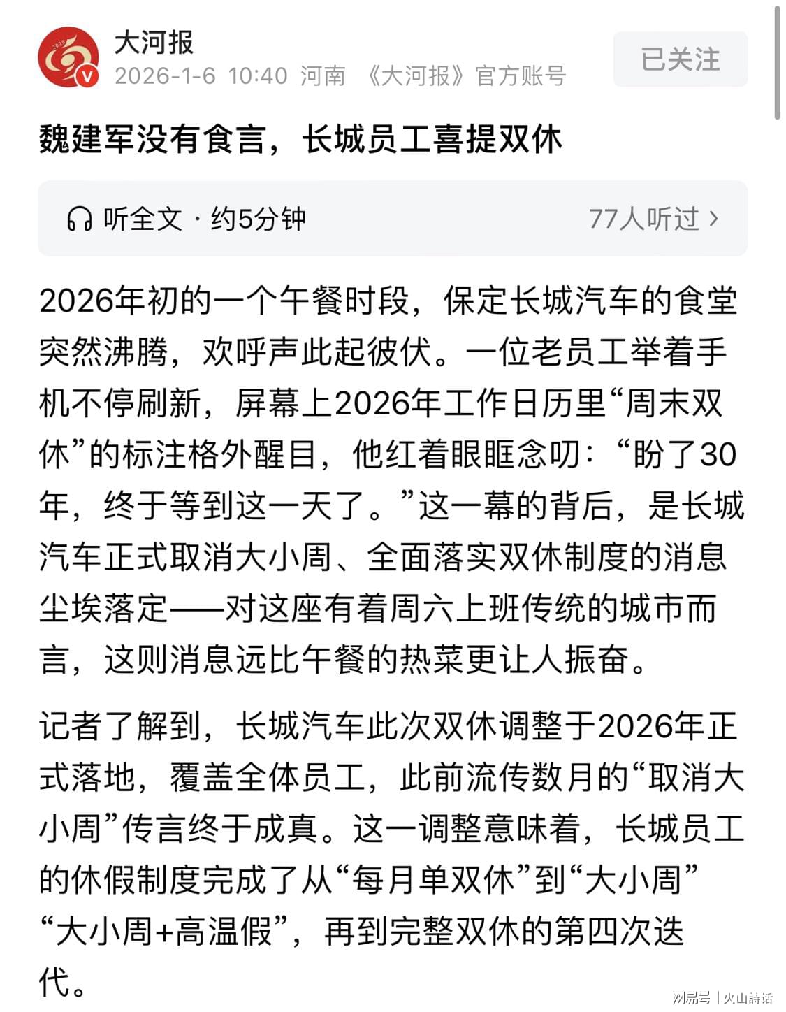 可以肯定,双休不只是员工的福利,更是行业回归理性的标志。有业内人士分析,2026年将成为车企分水岭,告别高强度加班的粗放竞争后,技术创新、产品品质和全球化能力将成为核心竞争力。对普通从业者而言,长城的调整或许只是开始,更多车企的“减负”可能在路上。