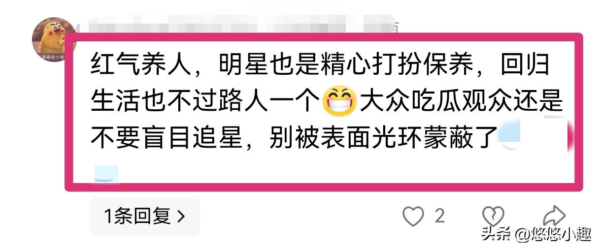红气养人,明星也是精心打扮保养,回归生活也不过路人一个,大众吃瓜观众还是不要盲目追星,别被表面光环蒙蔽了。