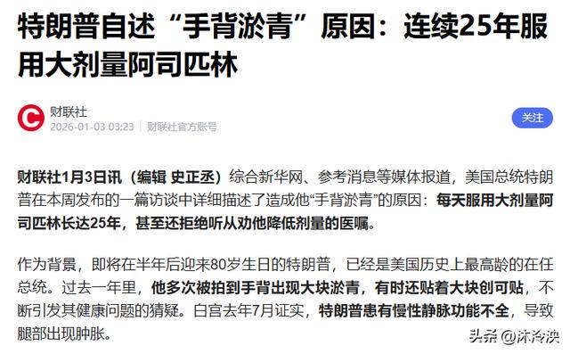 一开始大家还在猜测淤青的原因,后来有知情人士向《纽约时报》爆料,真相其实是特朗普连续25年每天都服用325毫克的大剂量阿司匹林。