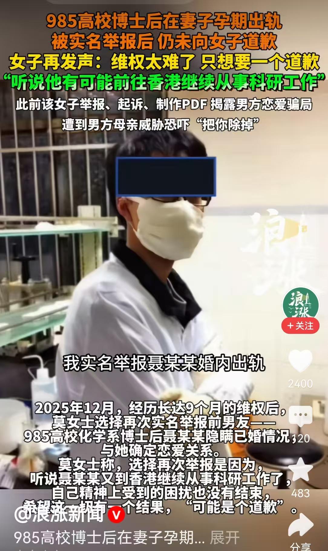 也就是说聂某某在妻子怀孕期间,又找了她当女朋友同居,还说就是喜欢她的高颜值,还有她温柔大方的性格。现在她要实名举报聂某某,听说聂某某要到香港从事科研工作了,她的要求很简单,让聂某某公开给她道歉。