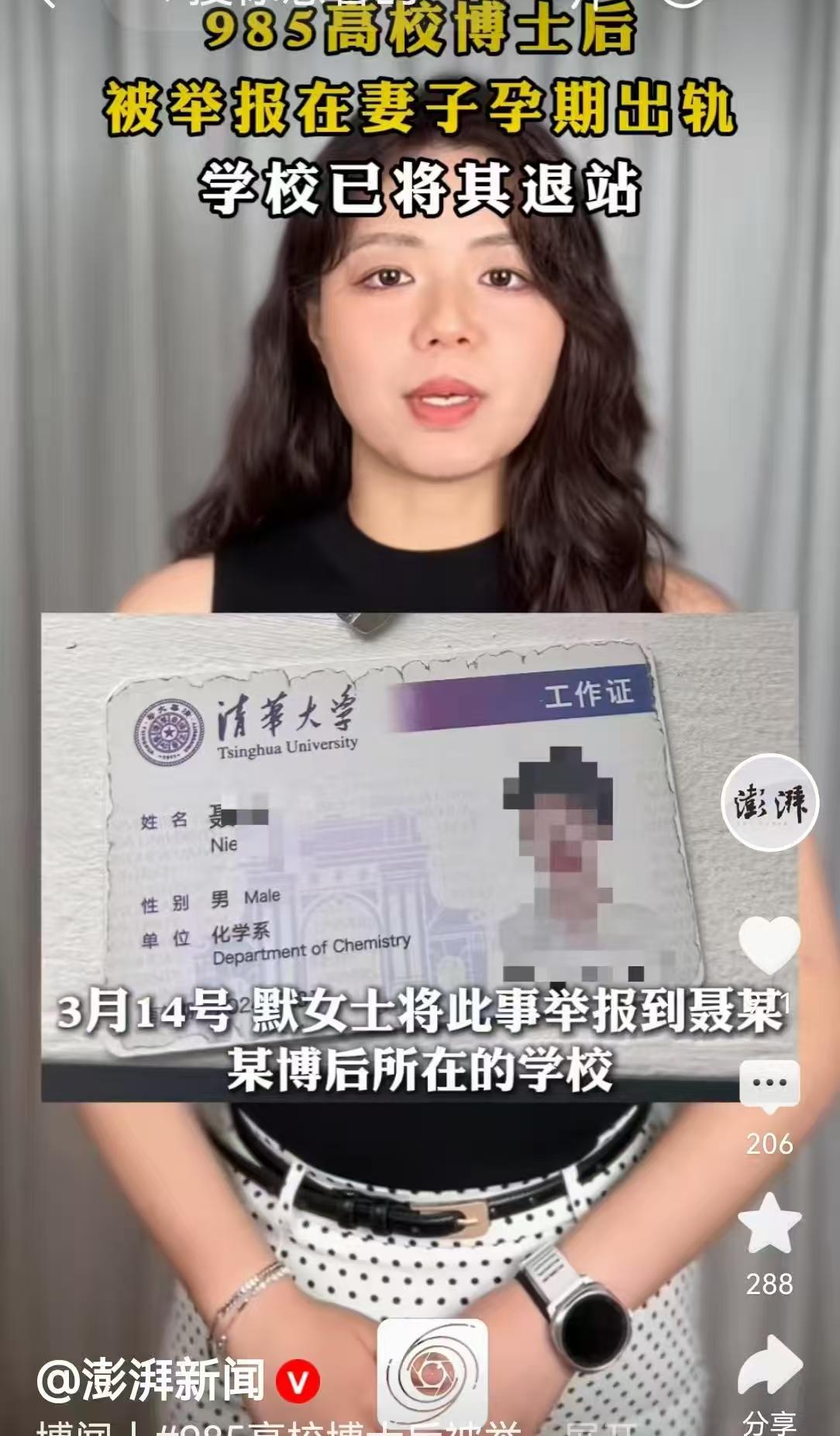 1月10日报道,莫女士实名举报清华大学博士后,从事化学研究工作的聂某某道德败坏,在妻子怀孕期间到相亲网征婚。导致她被“小三”,也是察觉到聂某某情况不对,她用聂某某手机订外卖时,发现聂某某不但有妻子,妻子还给他生了一个女儿,刚出生的女儿。