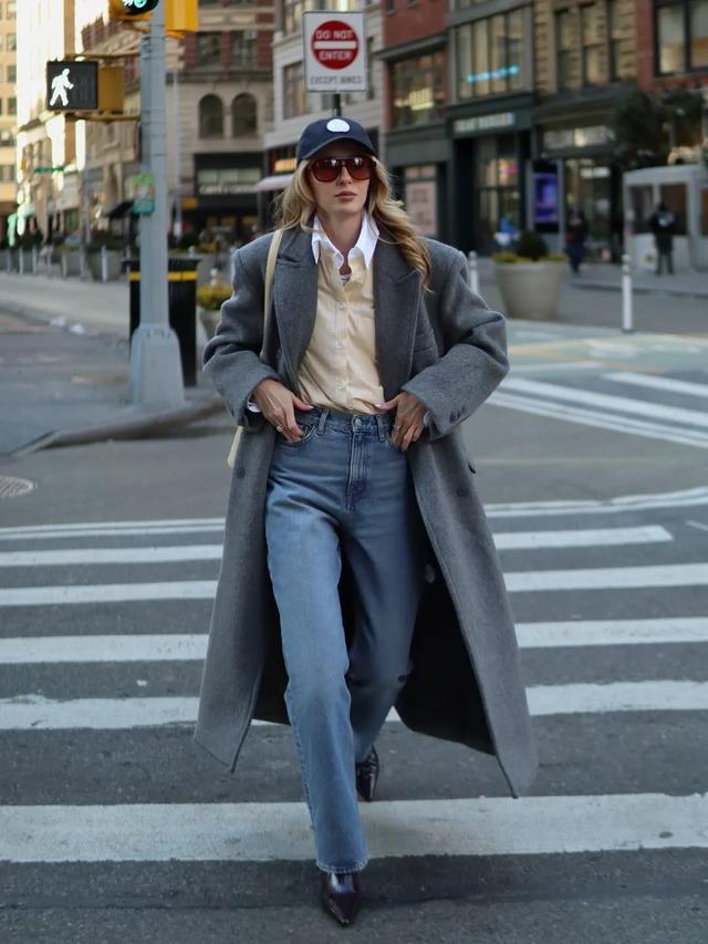 灰色大衣下叠穿黄白衬衫与牛仔直筒裤,脚踩短靴,头戴棒球帽。