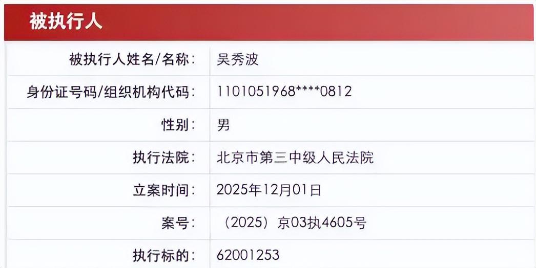 12 月 16 日,中国执行信息公开网显示,吴秀波新增了一笔 6200 万余元的被执行人信息,执行法院是北京市第三中级人民法院。
