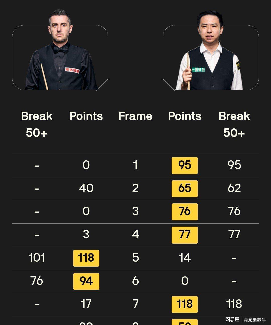 吴宜泽6-2肖恩墨菲,赛前双方排名,吴宜泽现役排名13,生涯至今1次排名赛冠军,墨菲现役排名第7,生涯至今12次排名赛冠军,大满贯成员,各项数据都是墨菲占据绝对优势,本场比赛采用规则11局6胜,比赛一上来,吴宜泽状态相当出色连下三局,其中在第三局打出单杆137分率先取得3-0领先优势,第四局,墨菲62分扳回一局,上半场吴宜泽3-1领先,第五局,吴宜泽64-61再次绝杀墨菲,第六局,打出79分扳回一局,最后吴宜泽连下两局以6-2淘汰墨菲晋级四强。