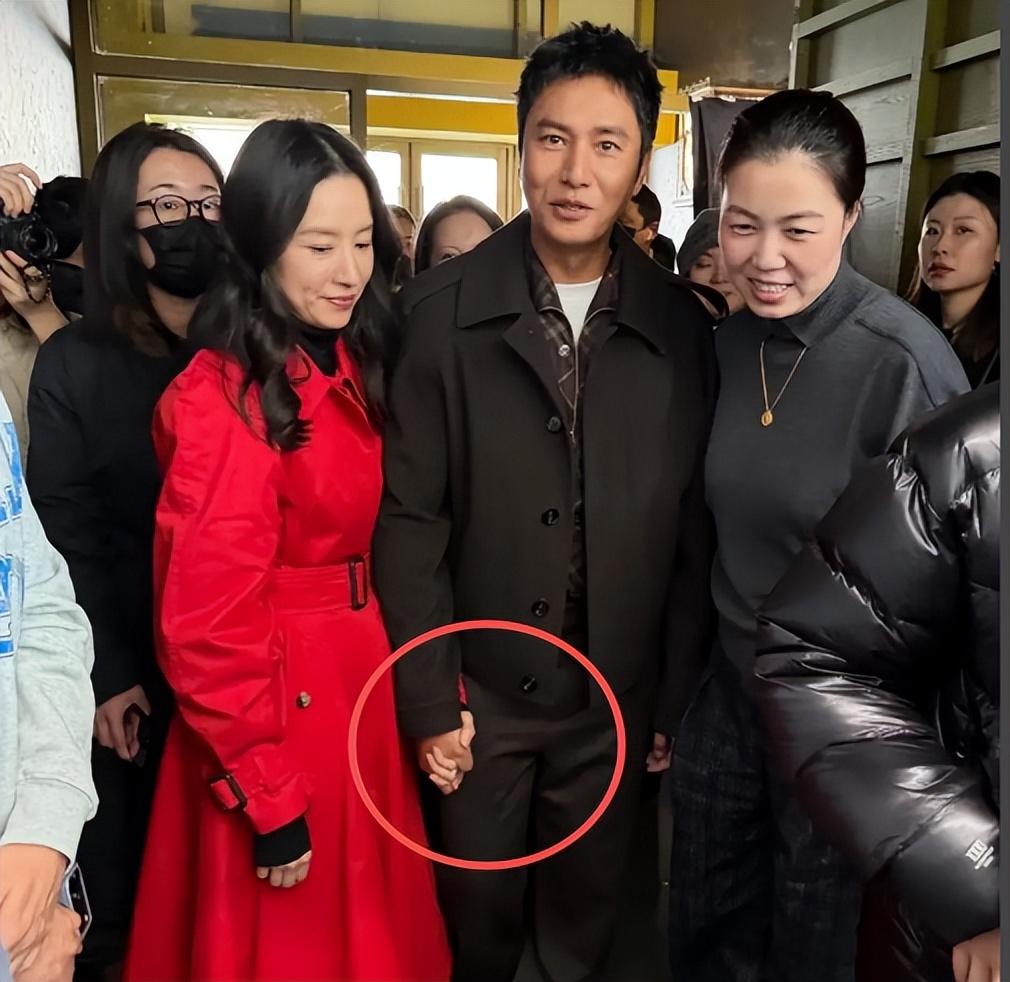 董洁身着亮眼红色风衣,长发微卷尽显女人味,身旁的陈坤则以利落短寸搭配深色夹克,两人并肩而行时,陈坤紧紧牵着董洁的手,姿态亲昵自然。