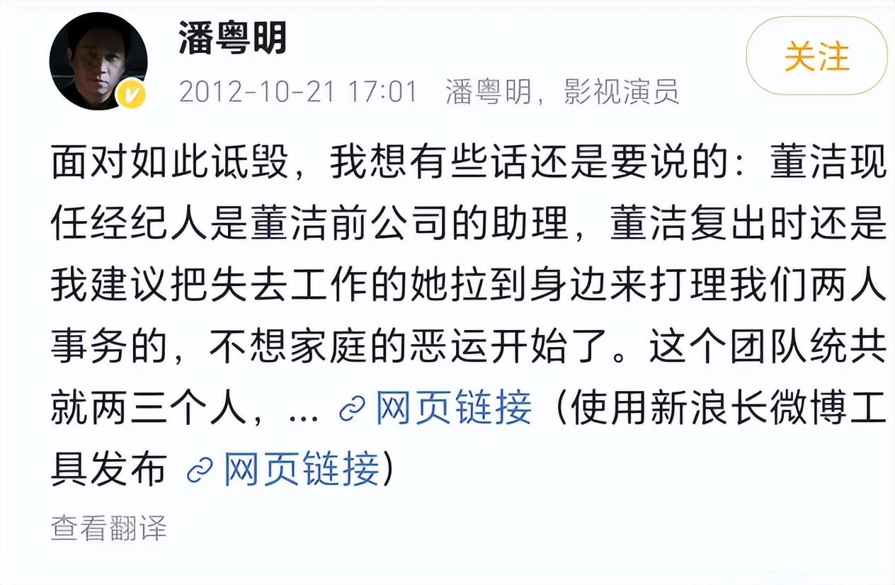 2012年10月,董洁毫无预兆地发文,称她和潘粤明已经在办理离婚手续。