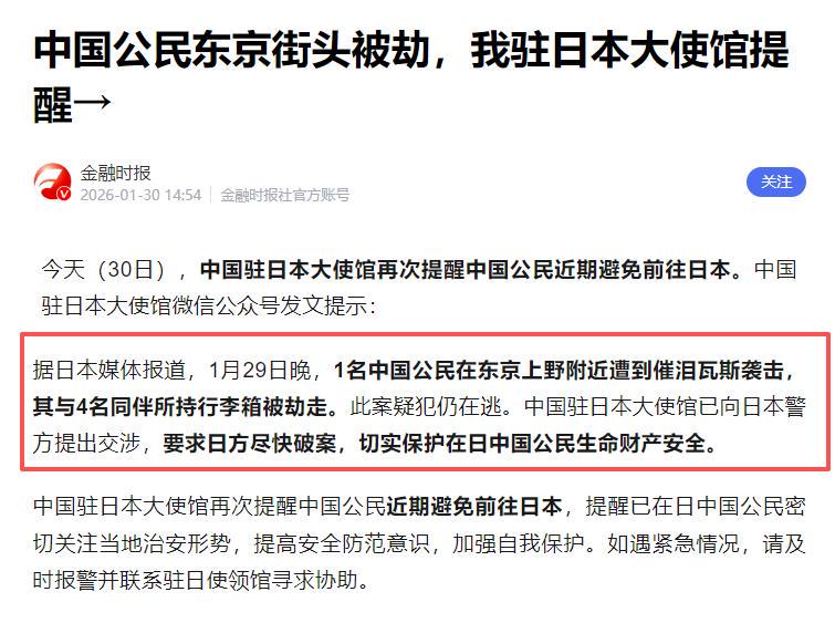 1月29日晚,一名中国公民在东京上野附近遭到催泪瓦斯袭击,他与四名同伴随身携带的行李箱被劫匪劫走,里面装有贵重物品和重要证件。