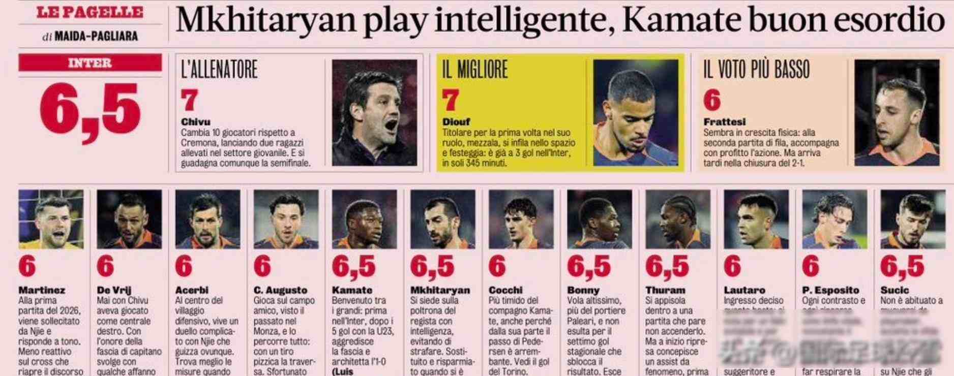 对阵都灵那场,恰尔汗奥卢没有出场,泽林斯基轮休,教练齐沃安排姆希塔良担任单后腰,结果姆希塔良对抗能力偏弱,对方好几次从他这里突破过去,场面差点失控,迪乌夫拿球以后总是过多盘带,一尝试过人就会丢球,弗拉泰西在站位上也漏了人,整个后腰位置眼看就要撑不住,直到第56分钟苏契奇替补上场,他顶到中场中路之后立刻带来改变,苏契奇逼抢很凶,恩杰几次拿球都被他断下,他自己带球12次一次都没丢,还多次通过横向转移直接撕开都灵的压迫阵型,赛后《米兰体育报》给他打了6.5分,和全场最高分并列,《罗马体育报》认为他在不熟悉的位置上表现不算特别突出,但实际效果摆在那里,看过比赛的人都承认他稳住了局面。
