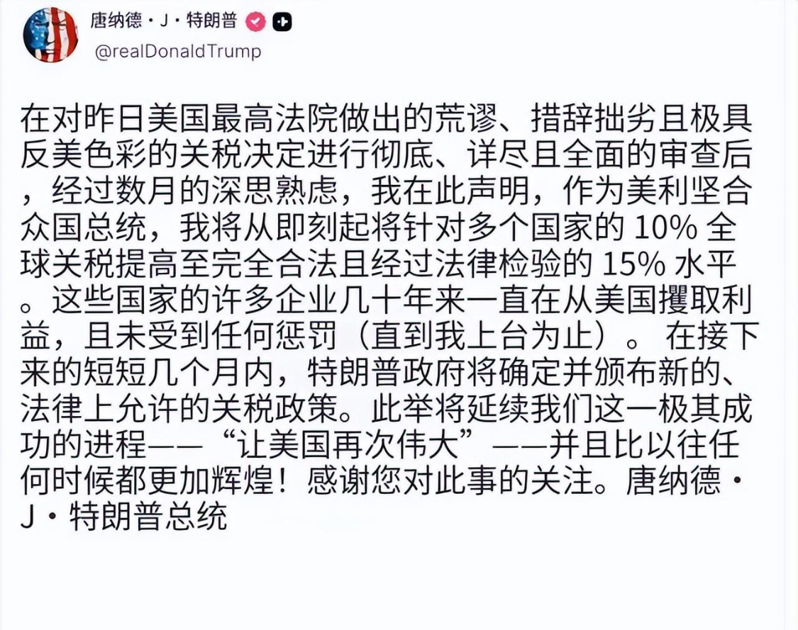 2026年2月21日,特朗普在“真实社交”上的一条帖文,把全球贸易圈的人都看傻了。前一天刚签的10%全球进口关税,当天直接涨到15%,而且从发帖时就立刻生效——不到24小时,这波“光速变卦”操作,谁能想到?更有意思的是,美国最高法院前脚刚判他之前的关税越权,他后脚就换了个法律依据接着来,还特意点了中国的名,这到底是临时应急,还是新一轮针对?