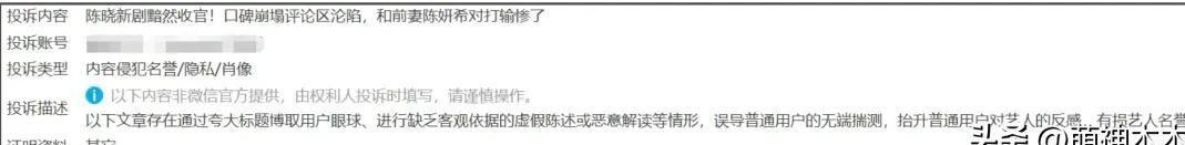 当陈妍希的新剧获得好评,而陈晓的作品反响平平,网络上出现对比声音时,陈晓方面迅速投诉了相关稿件,理由是“夸大事实博眼球”。