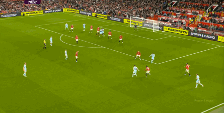 因为,曼联并没有选择常态性的高位逼抢,所以不太会暴露后场的空当,甚至在部分防守回合里,曼联会像对阵曼城和阿森纳一样,直接落成六后卫来应敌,这就会给布伦特福德的进攻带来很大的困扰,他们的球员质量并不足以攻破这种级别的防守: