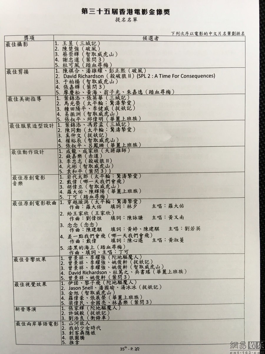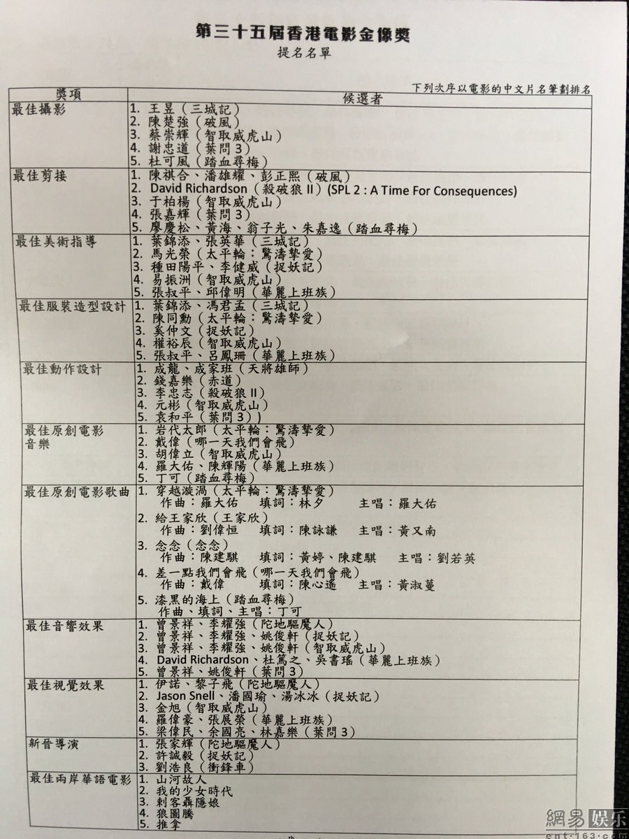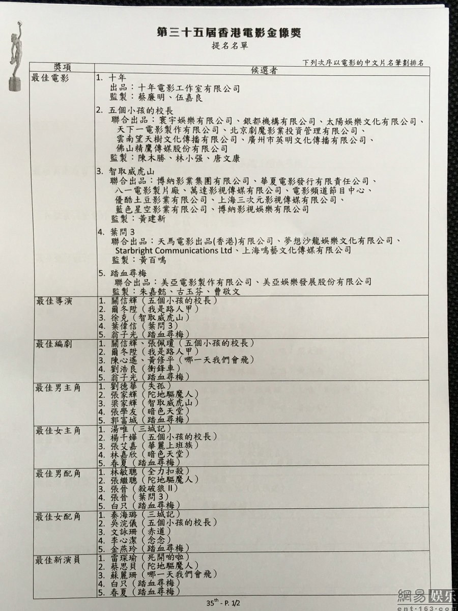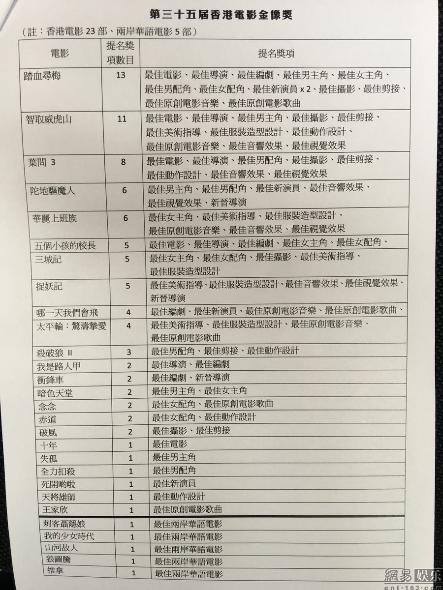 第35届金像奖公布提名 张学友刘德华争影帝