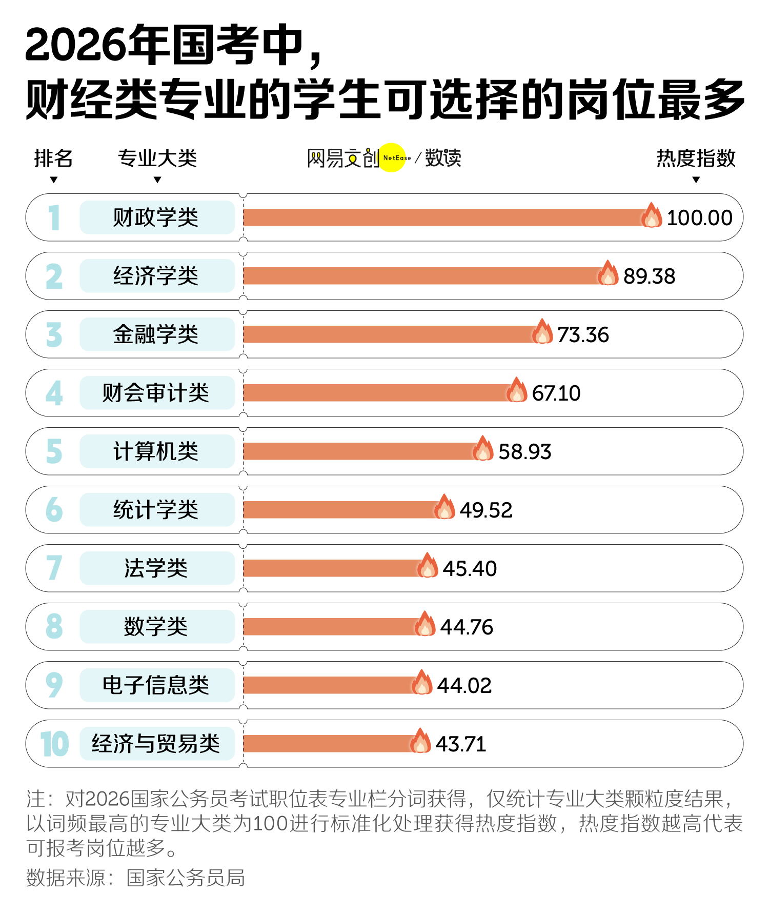 不同专业的考生悲喜也不相通,因为他们拿到的入场券数量并不一样。 如果考生读的是财经类专业,那 TA 会有很多选择,因为可报考岗位最多的 Top3专业大类都与财经沾边。 而且几乎每年如此,这和税务系统是招聘大户不无关系。就2026年国考而言,根据我们的统计,税务系统计划招录25004人,约占总招录人数的65.6%,较去年上涨六个百分点。