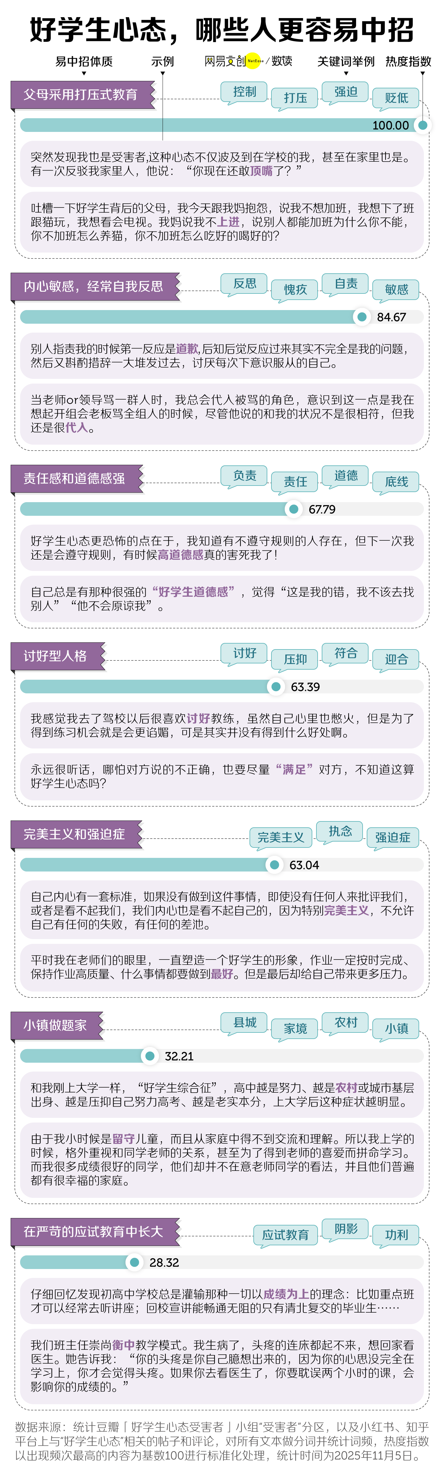 性格本身没有对错。只是很多网友发现,爱反思、敏感、爱讨好的人,更容易形成好学生心态,而这往往和打压式教育有关。