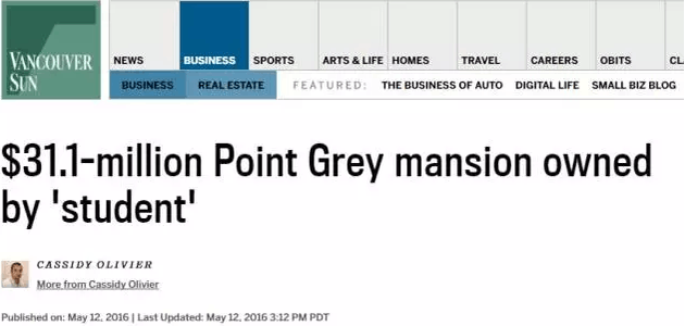 这位 Huang 同学,让每经小编不由地想起另一位叫做“Tian Yu Zhou”的同学。据《温哥华太阳报》5月一篇报道:今年初,一位注册名叫" Tian Yu Zhou "的中国人以3110万加元(约合1.57亿人民币)的高价买下了温哥华格雷岬区一幢豪宅,这一价格也创下了今年温哥华豪宅最高成交价纪录,震惊了加拿大。同时文件显示,Tian Yu Zhou 的职业也是"学生"。