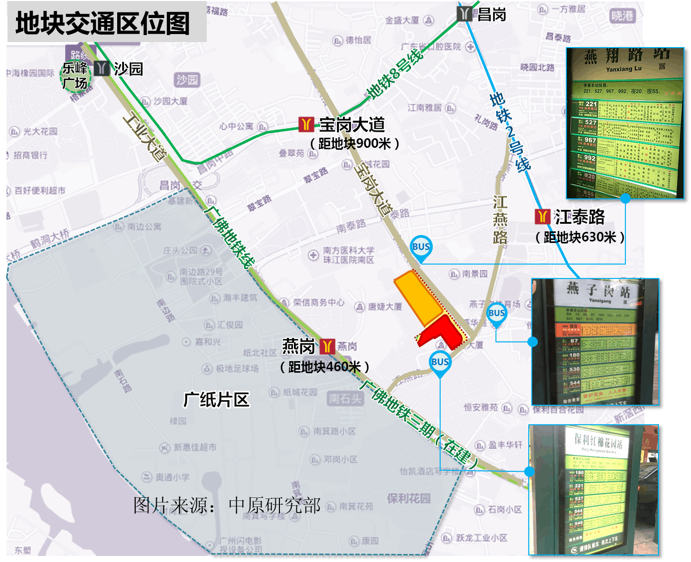 地铁方面,距离地铁8号线宝岗大道站约900米,距离地铁2号线江泰路站约630米,距离广佛线燕岗站约460米。