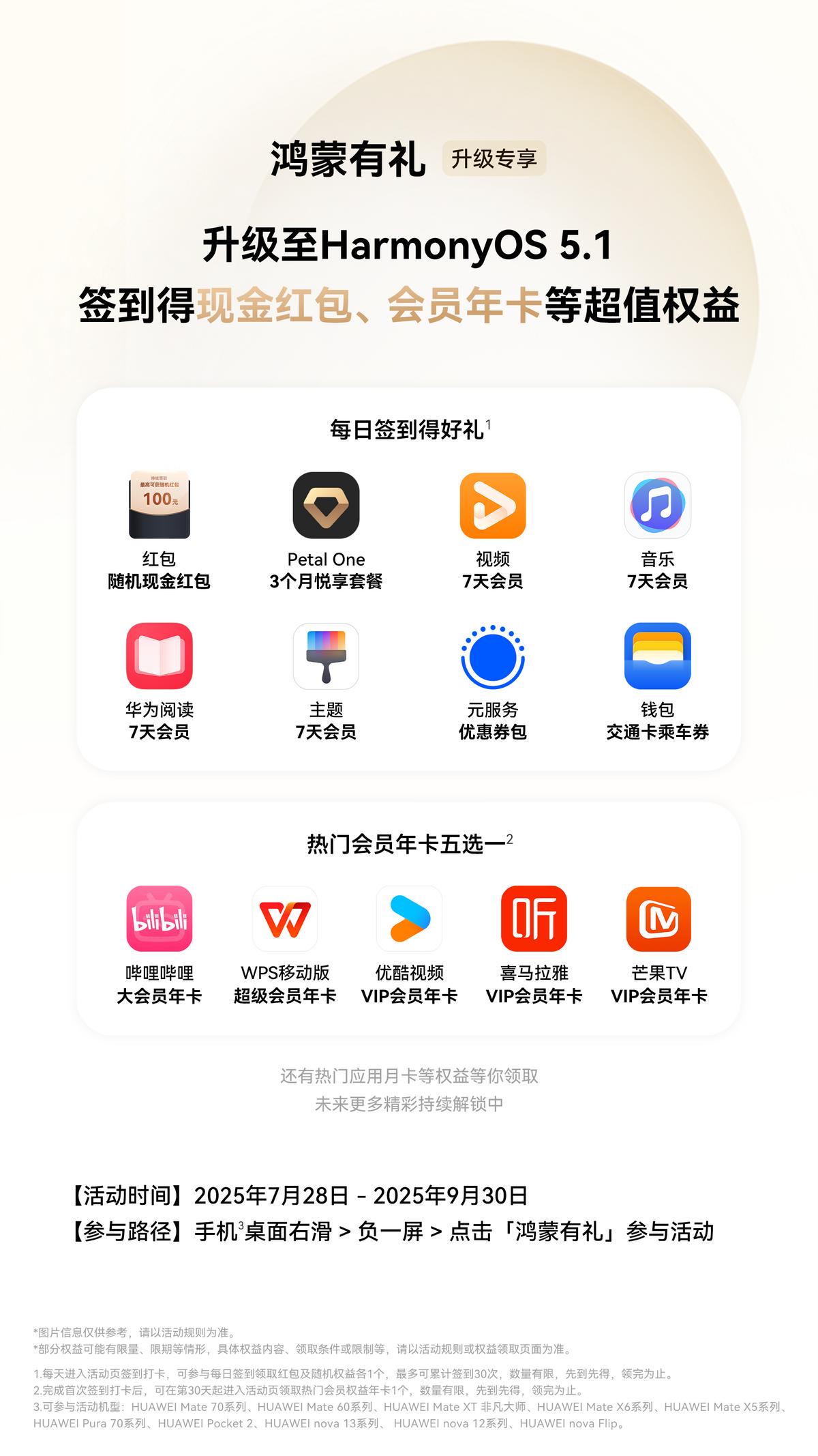 不仅如此,手机系统升级到鸿蒙5.1,还可以在负一屏领到升级专享的“鸿蒙有礼”。每天签到可以领随机现金和华为视频、华为音乐、华为主题等会员(会员随机送)。第30天打卡还可以免费兑换哔哩哔哩或者优酷、芒果TV、WPS、喜马拉雅等年卡会员权益,还没有升级鸿蒙5.1的朋友赶紧升级去薅羊毛!