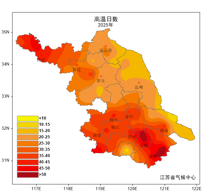 2025年全省平均高温日数31天,较常年(11天)偏多近2倍,与2024年并列历史第三,有7次区域性高温过程,8月12-31日遭遇有记录以来最晚的大范围持续强高温,10月6日有27站出现35℃~36℃的高温,刷新最晚高温日纪录。昆山(54天)、吴江(51天)等9站高温日数突破历史极值。西连岛(39.5℃)、滨海(39.4℃)等6站日最高气温突破历史极值。