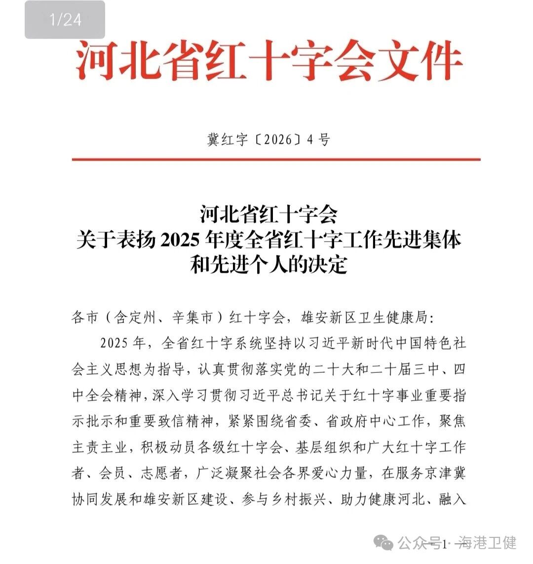 近日,河北省红十字会发布《关于表扬2025年度全省红十字工作先进集体和先进个人的决定》(冀红字〔2026〕4号),海港医院荣获“河北省无偿献血优秀组织单位”称号。秦皇岛市红十字会为此发来致谢函,对海港医院长期践行社会责任,热心公益慈善事业的善举给予高度肯定,并表示热烈祝贺和诚挚感谢。