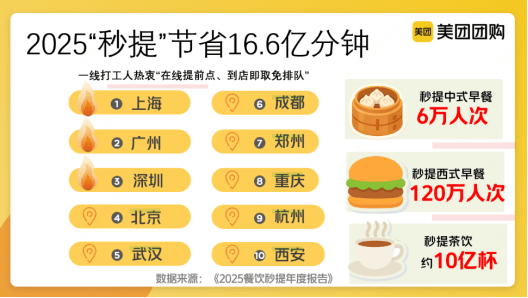 1月7日消息,美团发布《2025餐饮秒提年度报告》,据报告显示,2025年全国已有1.5亿人次使用秒提服务,累计节省约16.6亿分钟等待时间。秒提服务已连接25万家餐饮门店,覆盖上万个社区商圈、上千座火车站及景区,非办公区场景订单占比超过80%。
