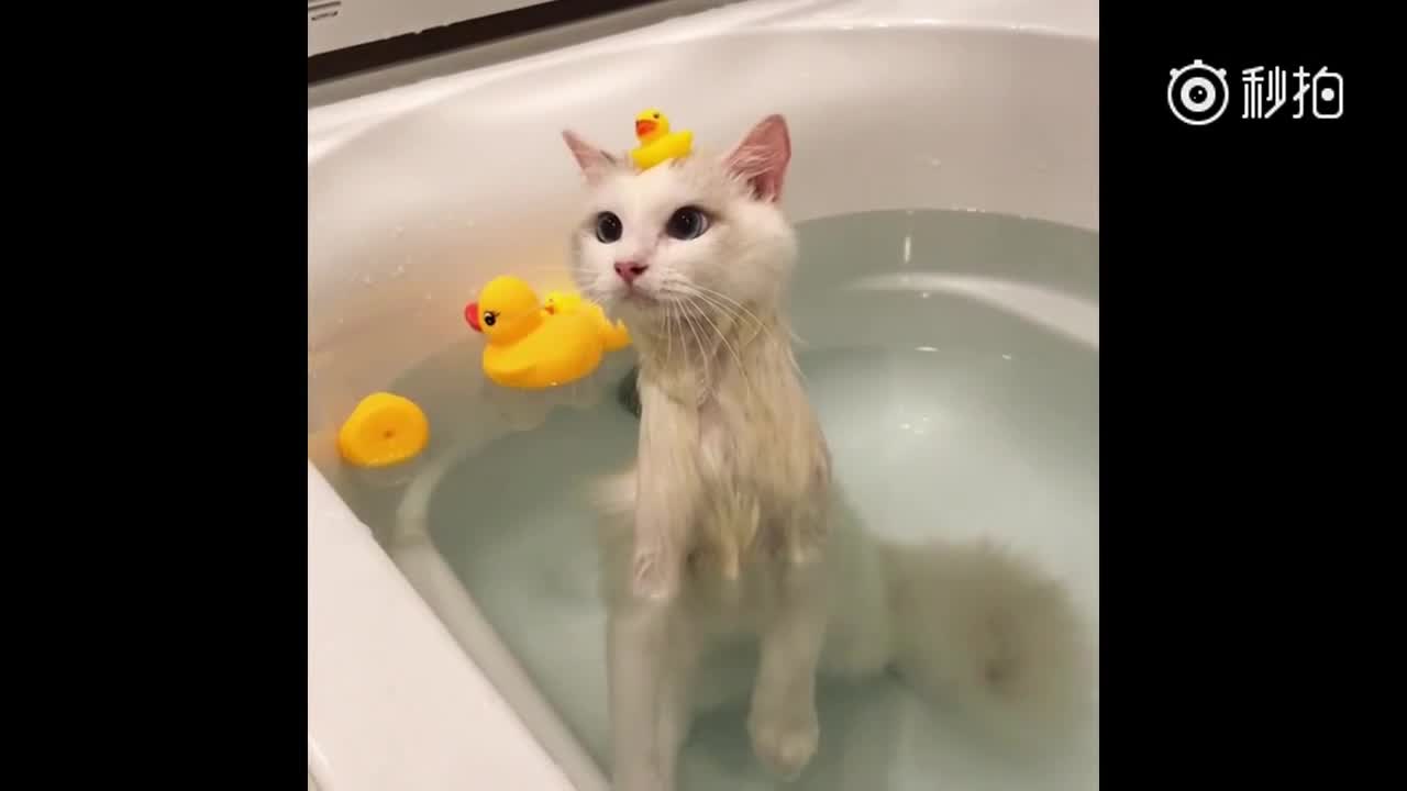 小猫咪竟然在乖乖的洗澡,还一直找自己心爱的小鸭子