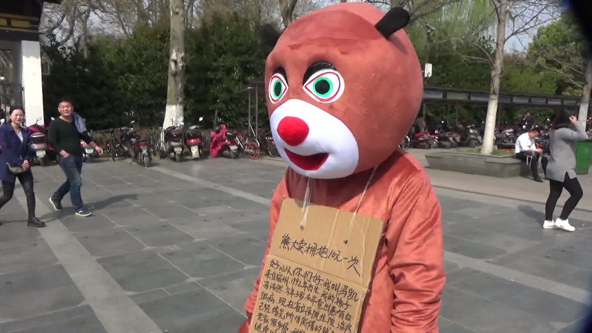 90后上门女婿扮熊大卖拥抱救子三天仅卖七个获百元