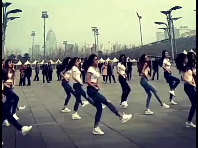 一群漂亮美女在广场上跳鬼步舞