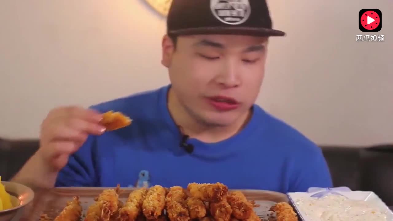 韩国帅哥吃脆皮炸虾,嘎嘣脆的声音,那叫一个叫香