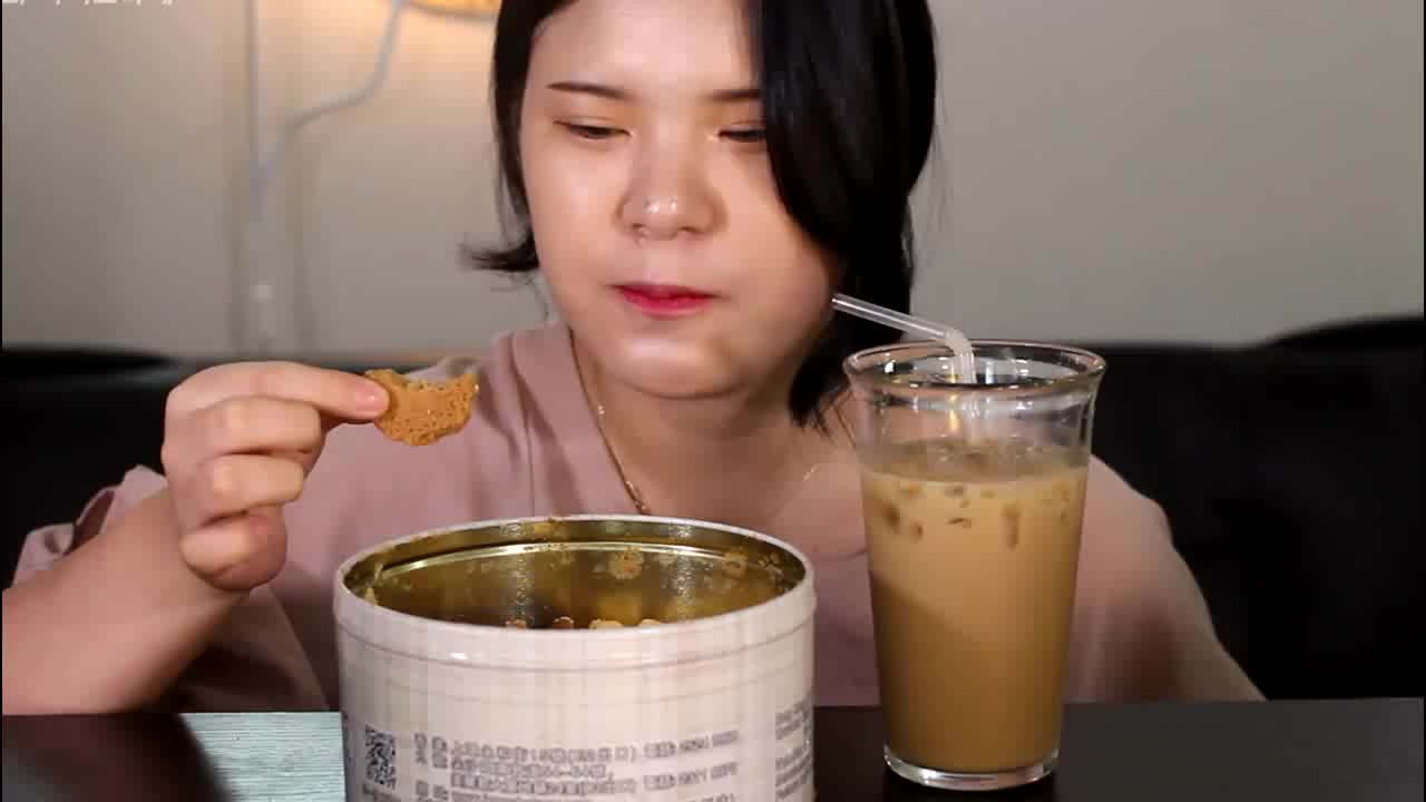 韩国美女吃一桶饼干和奶茶,吃完感觉脸又圆了一圈