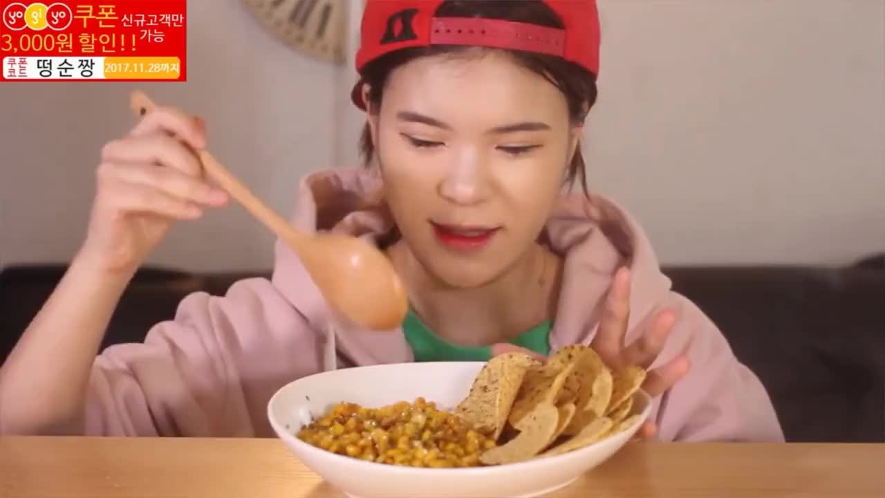 韩国豪放派吃播大胃王妹妹吃一大盘奶油玉米配薯片,喝果汁