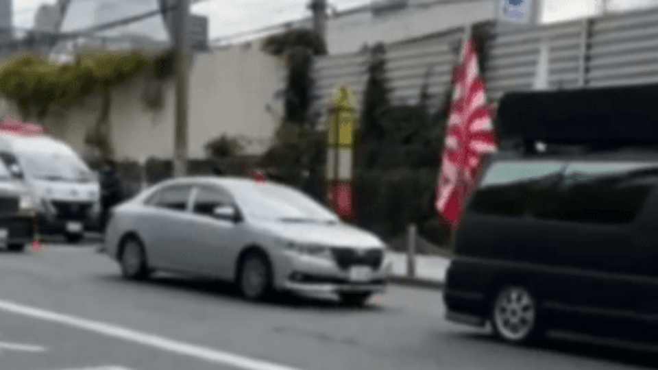 大量日本右翼在街头叫嚣游行,车上挂旭日旗与警察对峙