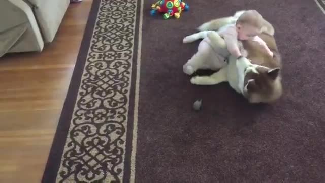 亲亲抱抱还被推倒,二哈带小孩子居然能这么耐心温柔