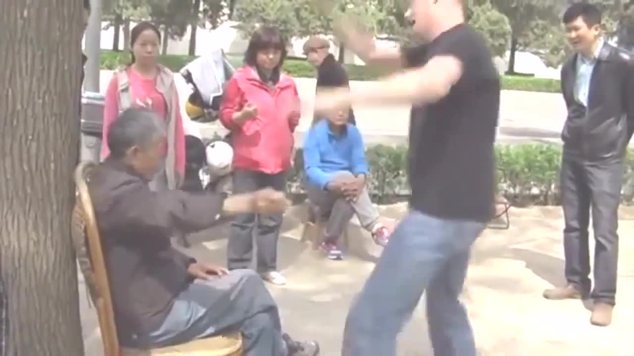 这位老人太极练到如此境界,还没有碰到,老外就被弹飞了
