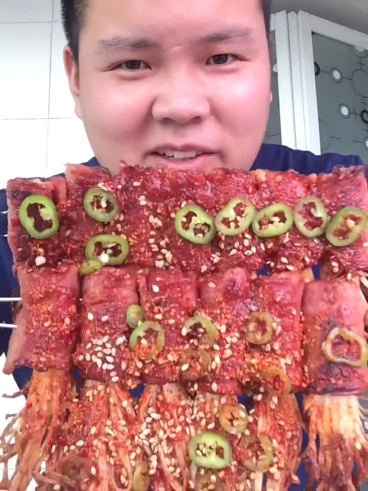 小伙狂吃自制的麻辣金针菇