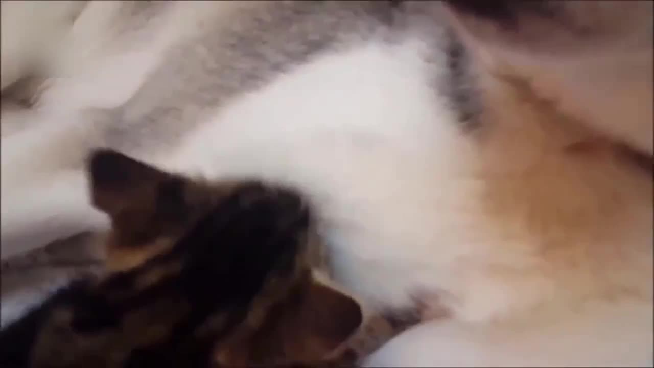 猫猫缠着狗狗要奶喝,狗狗不仅不厌烦还一脸宠溺