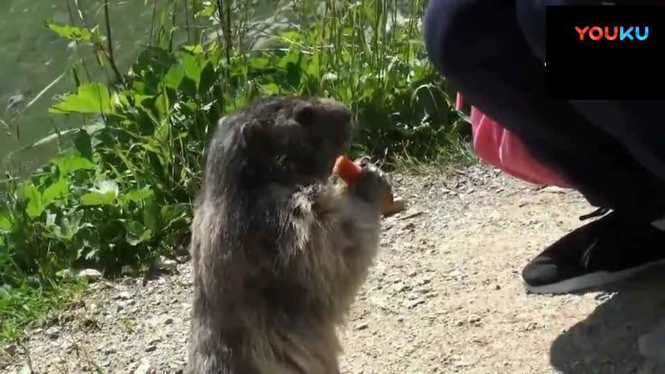 土拨鼠一见到有人, 立刻出来卖萌讨吃的