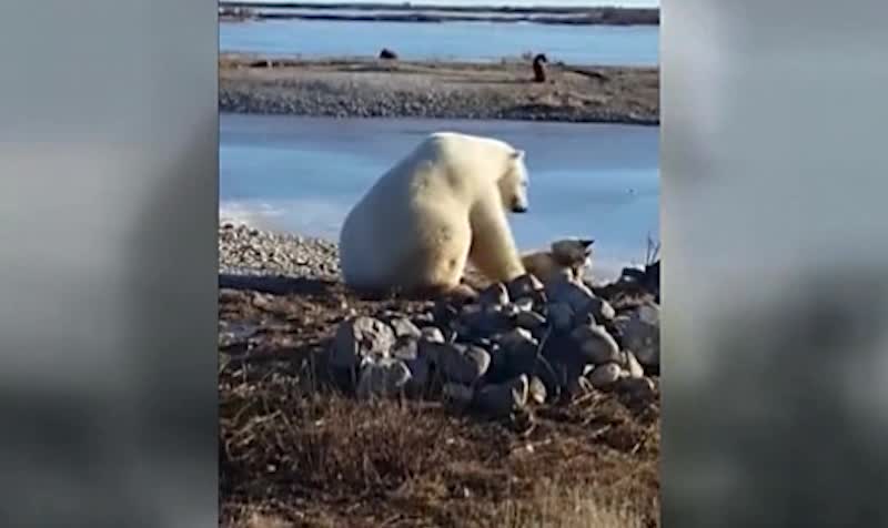实拍: 北极熊向雪橇犬示好, 上演摸头杀