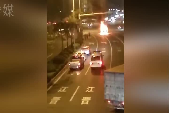 一轿车马路中央突然自燃,火焰冲天。