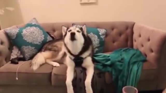 主人给哈士奇放狼嚎的音乐,二哈学起来也是有模有样