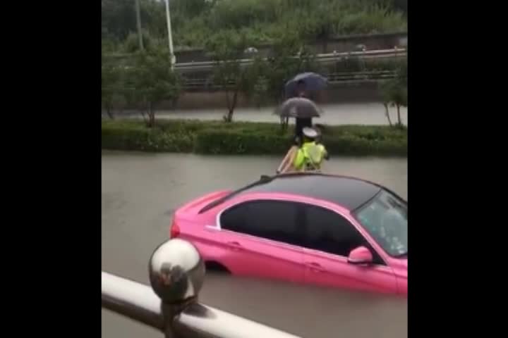 9月25日上午,南京,一场大雨.交警徒步涉水救助被困女司机